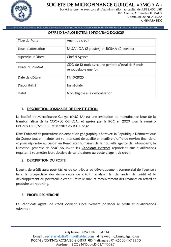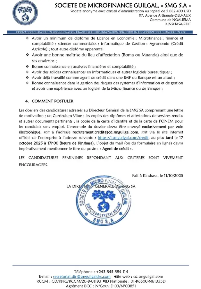 Les dossiers des candidatures adressés au Directeur Général de la SMG SA comprenant une lettre de motivation ; un Curriculum Vitae ; les copies des diplômes et attestations de services rendus et autres documents pertinents ; la copie de la carte d’identité et de la carte de l’ONEM pour les candidats sans emploi. L’ensemble du dossier devra être envoyé exclusivement par voie électronique, soit à l’adresse [email protected], soit via le site internet officiel de l’entreprise à l’adresse suivante : https://l.smguilgal.com/credit, au plus tard le 17 octobre 2025 à 17h00 (heure de Kinshasa). L’objet du mail (ou du formulaire en ligne) devra impérativement mentionner le titre du poste : « Agent de crédit ».